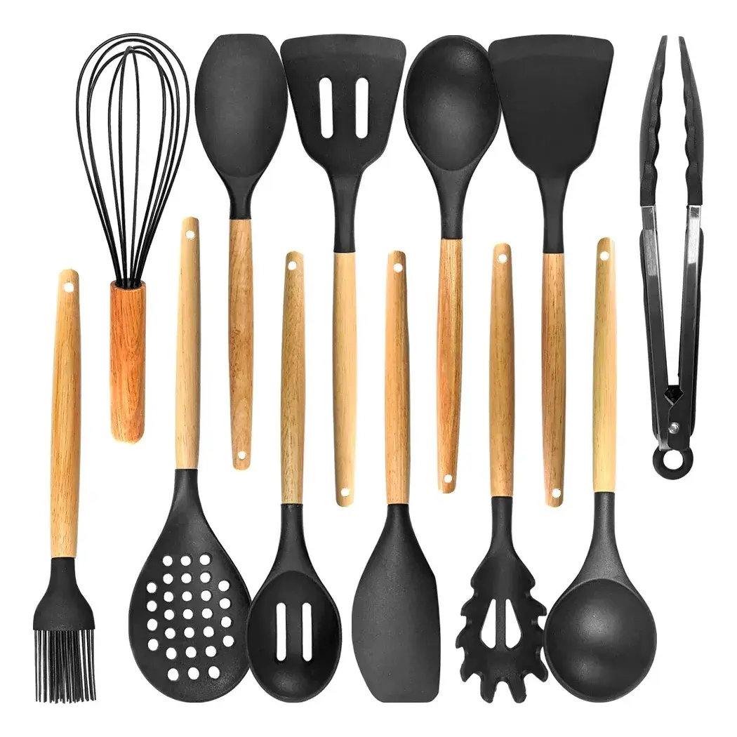 Juego de utensilios de cocina x12 de silicona con mangos de madera, resistentes al calor y seguros para todo tipo de ollas y sartenes. Incluye soporte organizador para mantener tu cocina ordenada. Prácticos, duraderos y fáciles de limpiar.